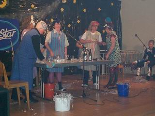 Der Beginn des närrischen Treibens eröffneten "Swuki" alias Christina Kalb und Michaela "Galaktus" Käsmann und führten durch das Programm des Abends. Die "Superstars" Michael Hofmann, Tanja Schön, Klaus ("Bob der Baumeister") Trost, Claudia Hofmann und Rita Schwalbach besangen mit abgewandelten Schlagertexten die Vorkommnisse im Dorf ("Räder im Wind...", "Bock mit dem Bagger"). Neuigkeiten erfuhr man auch von der Putzkolonne (Cornelia Sippel, Claudia Trost, Annegret Galler, Heidi Hess, Gabriele Kemmler, Rosemarie Sippel, und Christa Kalb). Von denProblemen einer Diät handelte der Vortrag von Roswita Prack. Überrascht über den eigenen Auftritt war unser Trainer Detlef Pabst sammt Gattin, als sie auf der Bühne ein Überraschungsmenü präsentiert bekamen. Als Kinder verkleidet waren es nämlich nicht sie, die die "Fütterung" vornahmen, sondern fremde Hände...